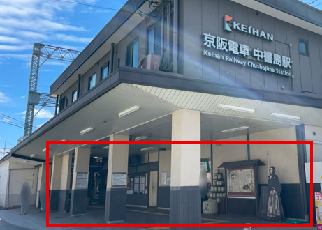 改札を出て赤枠の場所でお待ちください。点呼を取って船着き場へ向かいます。