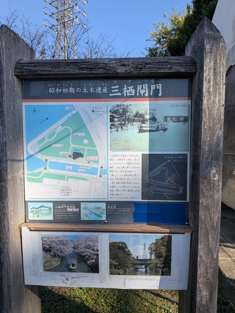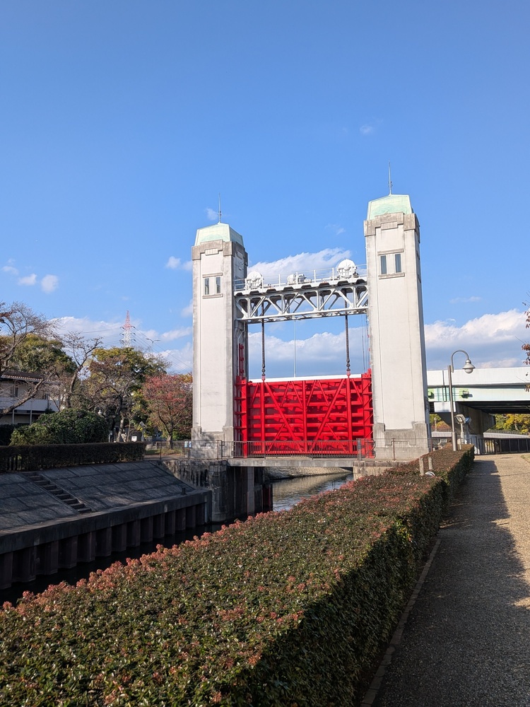 三栖閘門は、1929年(昭和4年)に完成した水門で、宇治川 と 濠川(“伏見港”へ通じる川)との水位差を調整するための施設です。両者の水位が異なるため、単に橋や運河で結ぶのではなく、“水を上下させる”ことで船の通行を可能にする、いわば「水のエレベーター」のような仕組みで作られていました。これは、世界的にも有名なパナマ運河 の閘門と原理は同じです。