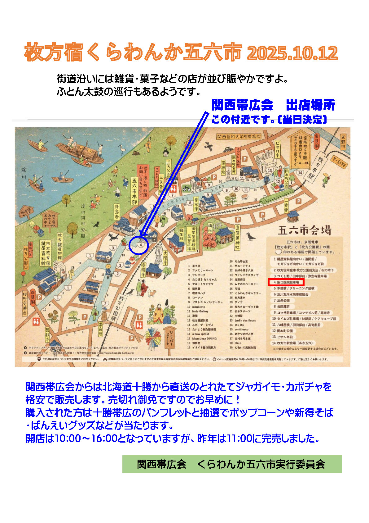 10/12(日)、枚方市の旧街道にて開催される「枚方宿くらわんか五六市」に関西帯広会が出店されます。 北海道十勝から取り寄せたジャガイモ・カボチャを破格で販売され...管理人 -